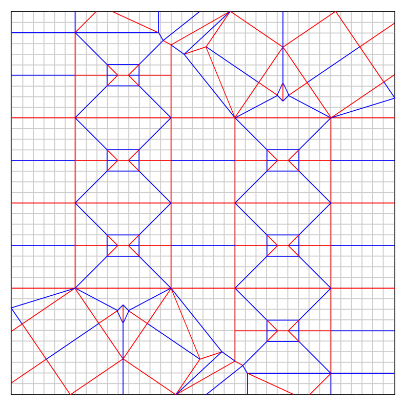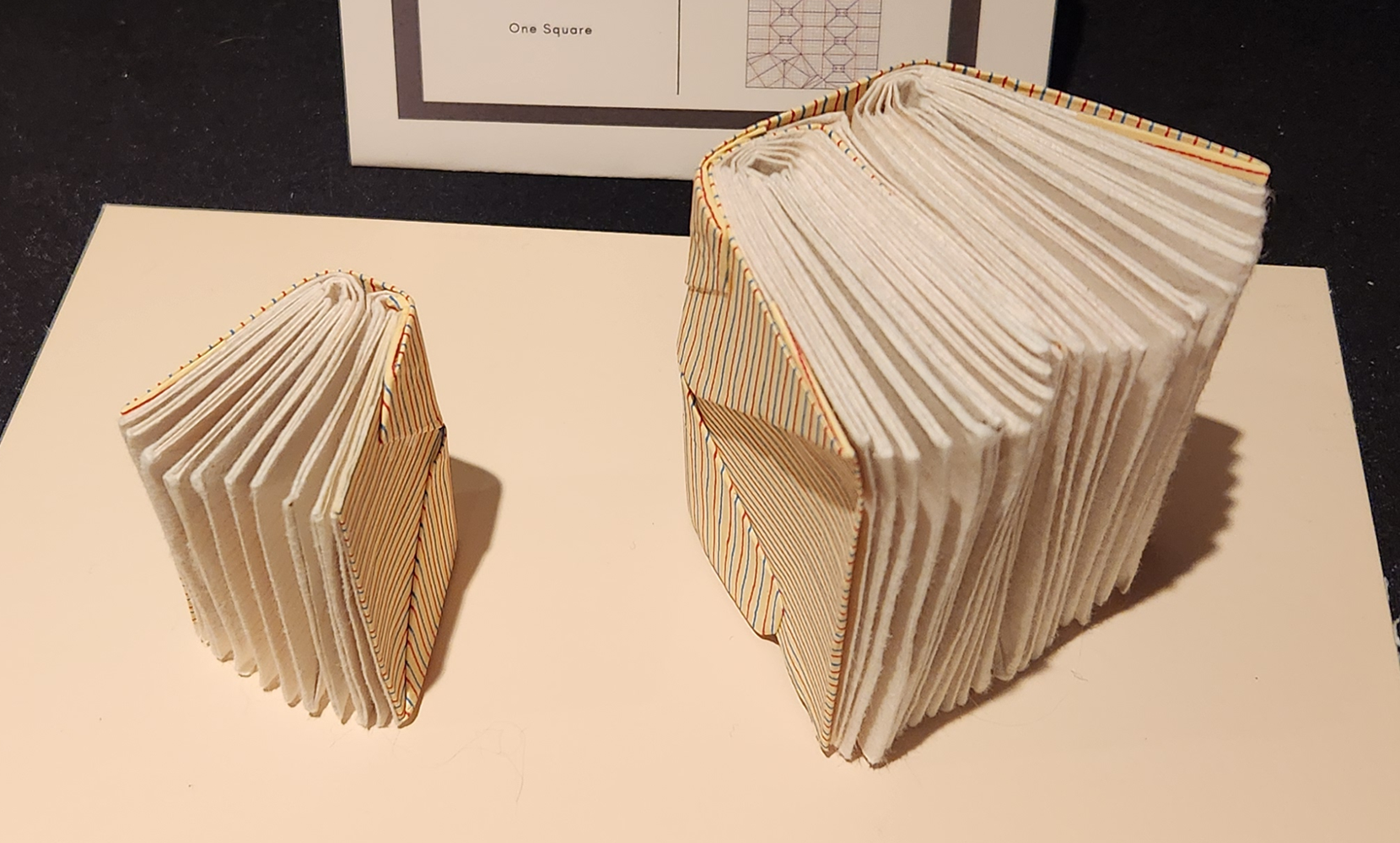 Snake Book 1.0 follows that initial sketch. I decided to break Rule 2, as some pages have a folded edge running down the diagonal, because I really wanted the crease pattern to demonstrate how the pages snake around the square (and also because of some intriguing geometry that works out for reasons I don’t understand). It has a Book Efficiency score of 41% (22 pages on an 18ths grid), and it scales up decently well to a book with 46 pages.
