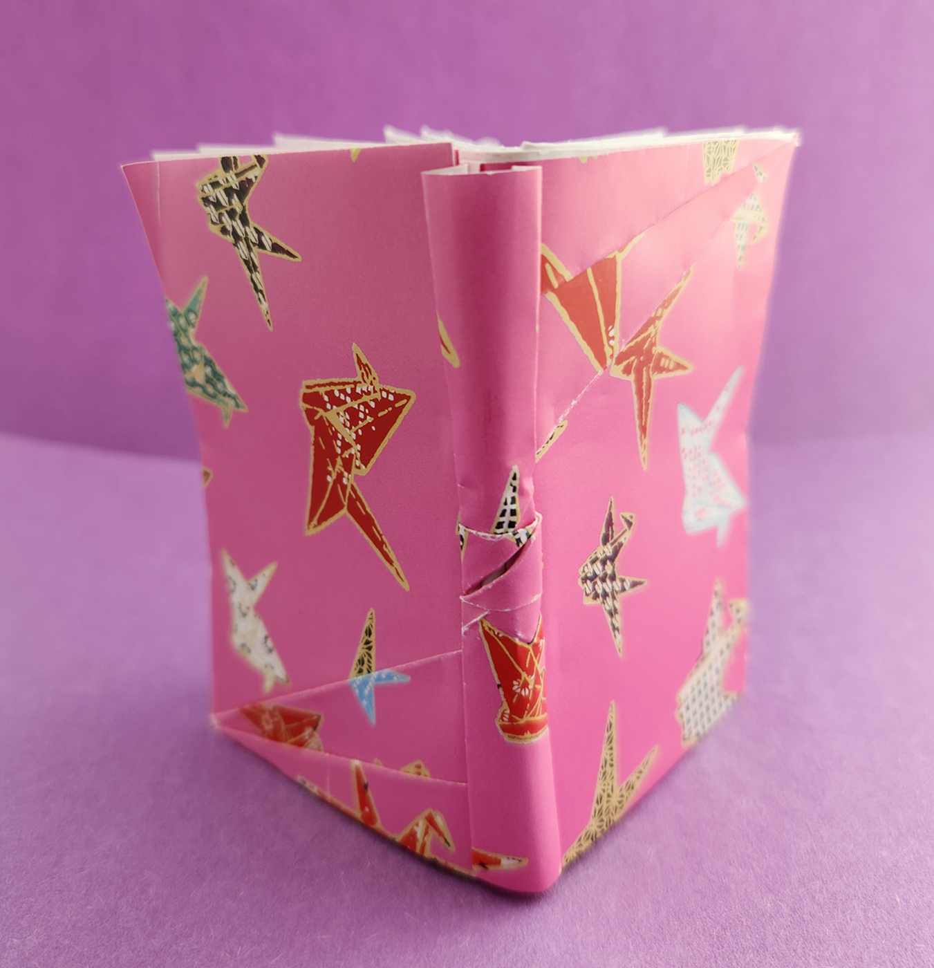 For Snake Book 2.0, I figured there must be a way to improve the efficiency, so I introduced some Pythagorean triangles. This one has a Book Efficiency score of 47% (20 pages on a 16ths grid), and it’s quite scrappy. The cover has some folded edges that reinforce the snaky design, and the cover’s spine is actually folded from two pages extruded through the middle of the book.