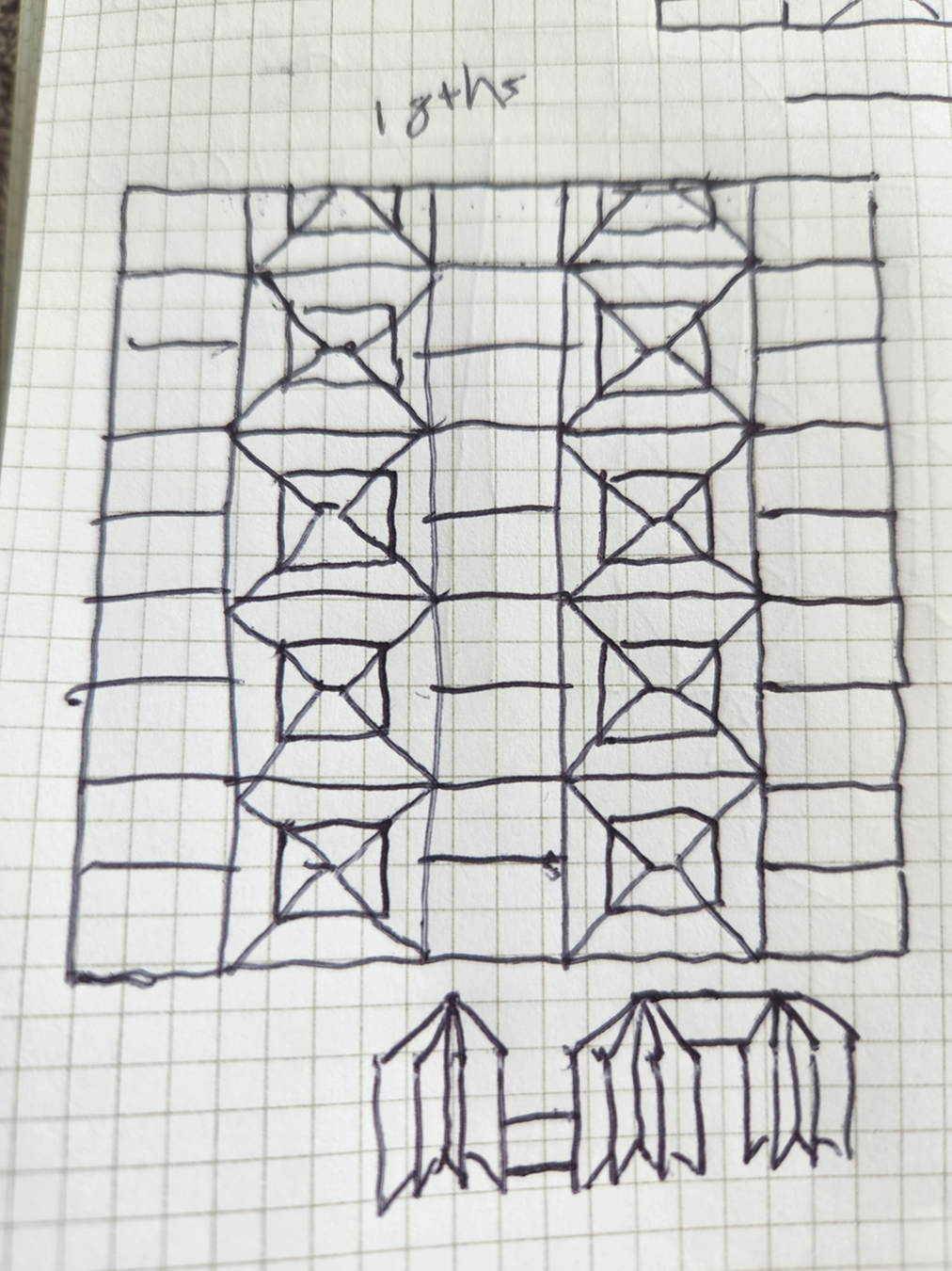 My first thought was that the most obvious way to fold pages efficiently is with a pleat running down the edge of the paper. To fill out the square, you need multiple columns of those pleats. Then connecting those columns is a spine that snakes its way from bottom to top (see the crude sketch below). Hence, the Snake Book!
